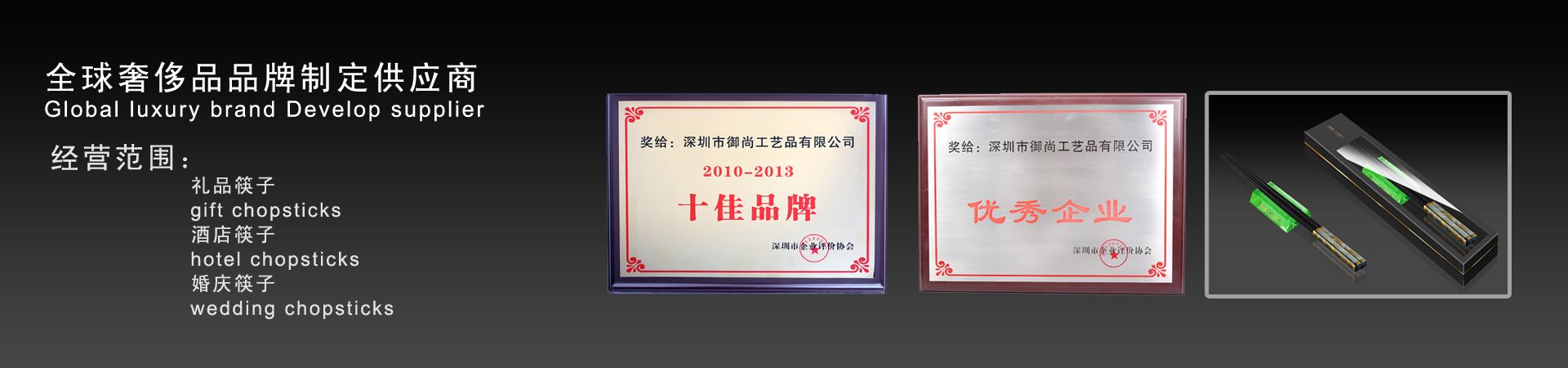御尚健康產(chǎn)業(yè)(深圳)有限公司旗下御尚工藝筷子榮獲深圳市企業(yè)評價協(xié)會授予的2013年度“優(yōu)秀企業(yè)”和年度“十佳品牌獎”稱號。 深圳市御尚工藝品前身為深圳市御尚工藝筷子廠,是御尚健康產(chǎn)業(yè)(深圳)有限公司和香港御尚實業(yè)有限公司全資子公司,是一家專業(yè)從事高檔筷子及紅木工藝品設計,研發(fā)和銷售及生產(chǎn)為一體的專業(yè)供應商,位...【更多詳情】